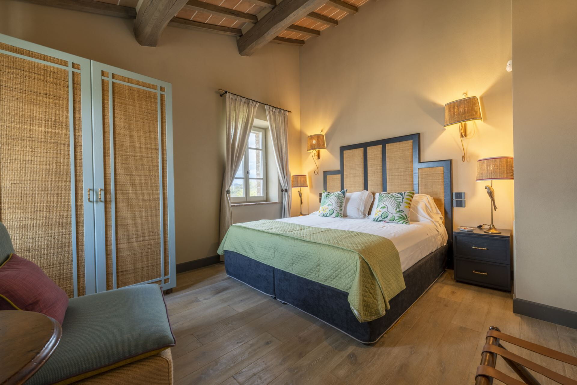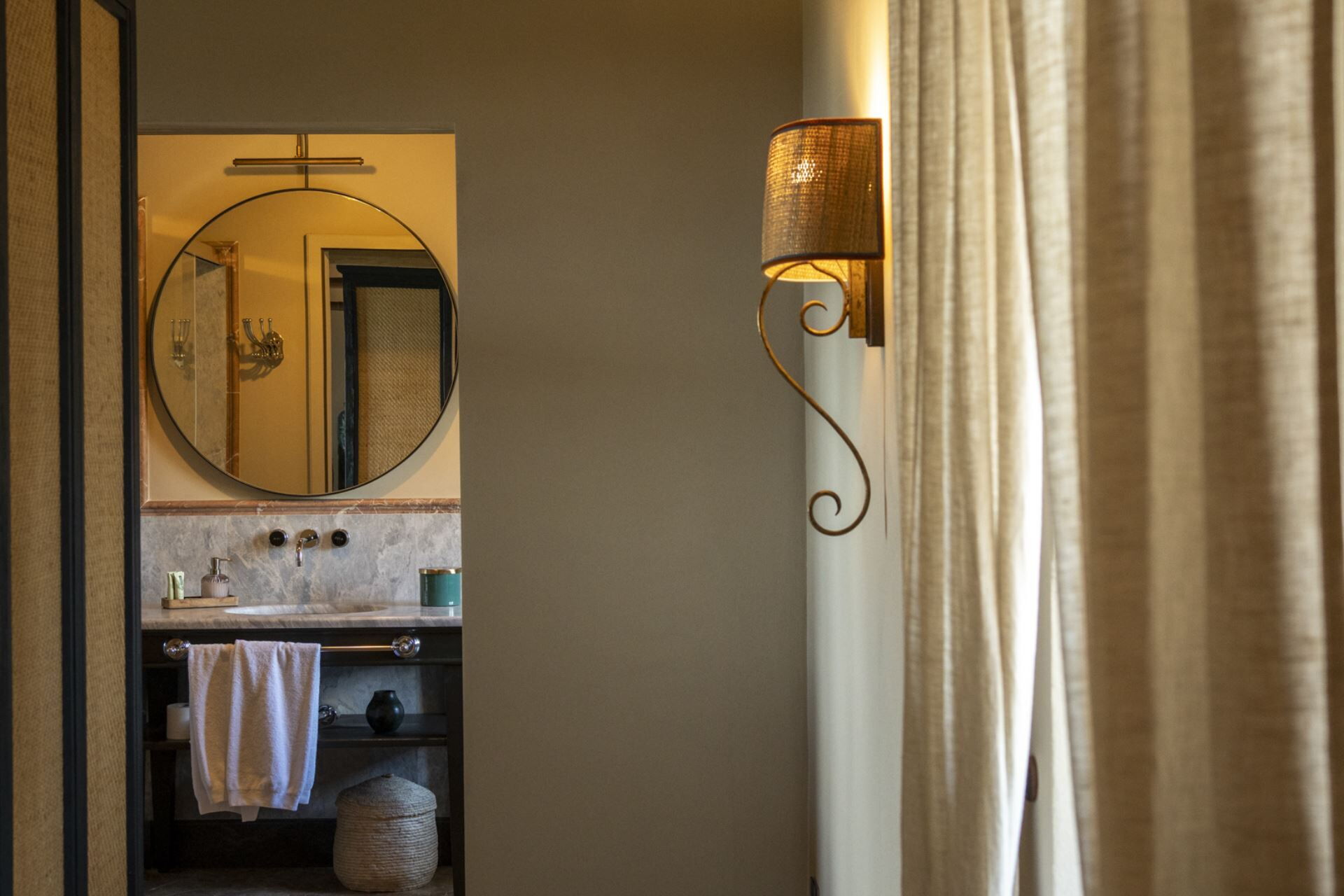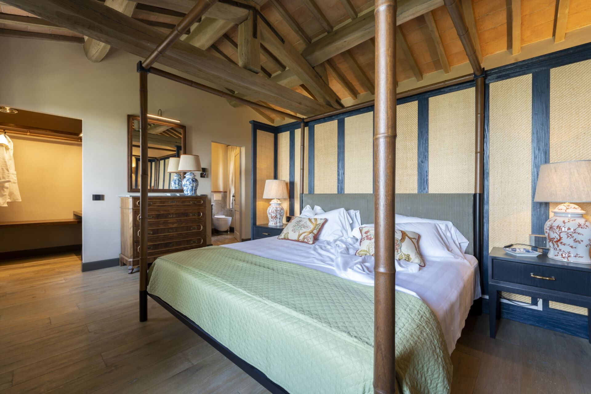 chambre avec salle de bain: grand lit à deux places (largeur: 180m, longueur: 200m), internet WIFI, climatisation, moustiquaires, canapé, coffre-fort, bassin, wc, bidet, douche, sèche-cheveux, sortie sur le jardin.