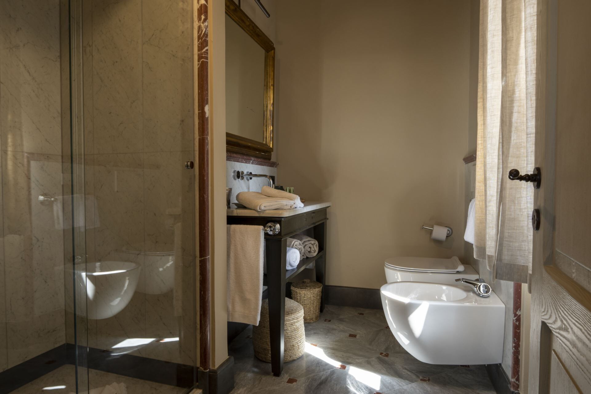 chambre avec salle de bain 4: grand lit à deux places (largeur: 200m, longueur: 200m), internet WIFI, climatisation, moustiquaires, canapé, bureau, bassin, wc, bidet, douche.