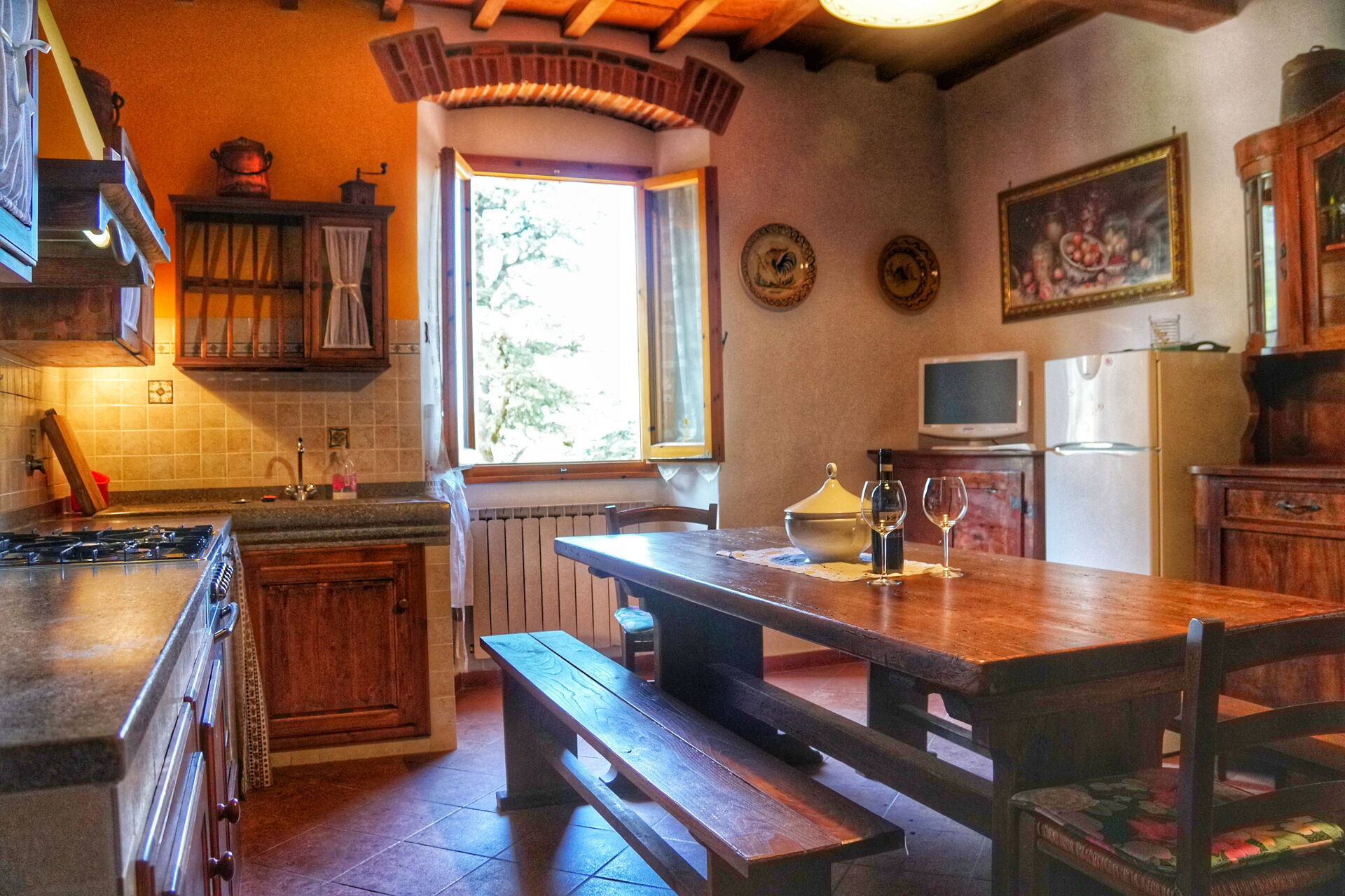 Si vous aimez cuisiner pour la famille et les amis il y a une cuisine bien equipée y compris four micro-onde, grille-pain et réfrigérateur, ainsi que, assez de vaisselle et couverts jusqu'à sept personnes. Dînez «al fresco» comme un vrai toscan, la véranda complètement équipée est le cadre parfait pour apprécier la cuisine, s'amuser en famille, et profiter du jolie beau temps toscan.