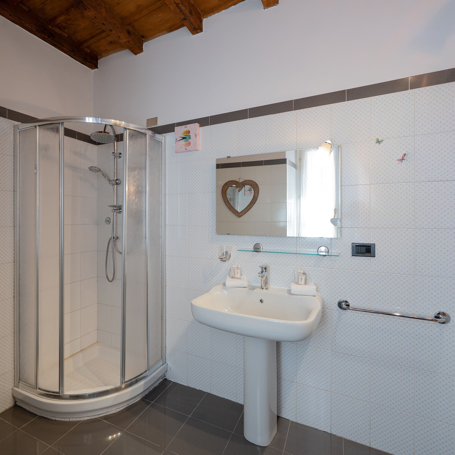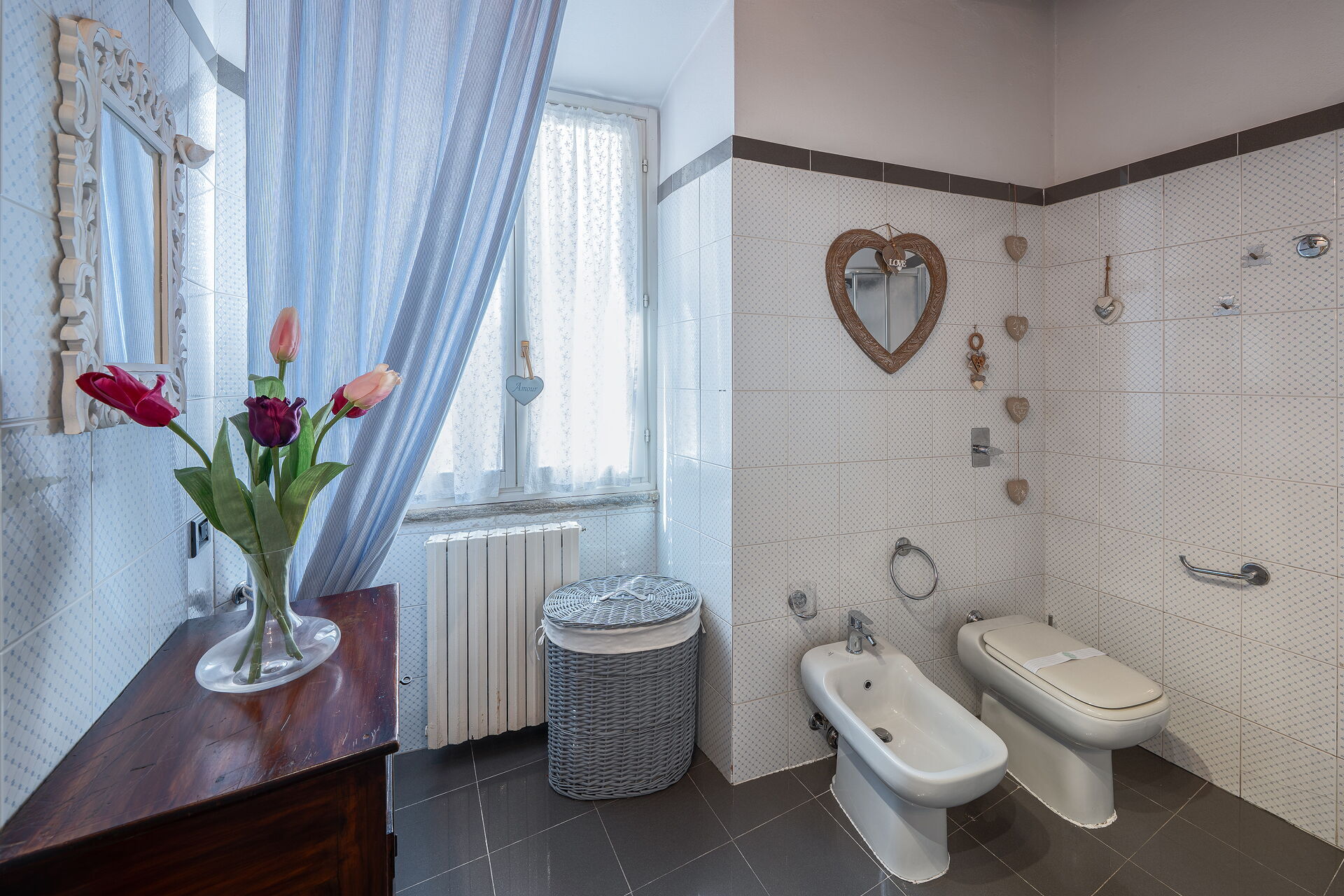 salle de bain: bassin, wc, bidet, douche, sèche-cheveux.