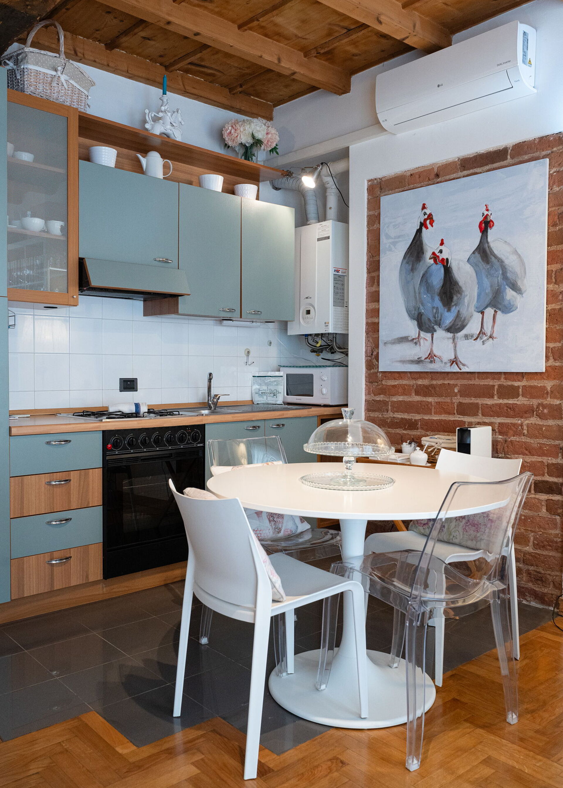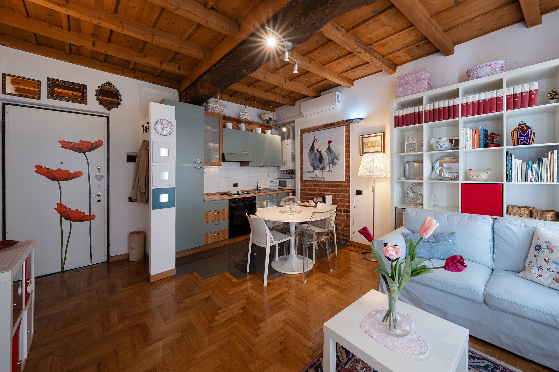 Cuisine – salle de séjour: cuisine bien équipée, table à manger, lave-vaisselle, réfrigérateur, congélateur, cuisinière, four, grille-pain, machine à café italienne, canapé, internet WIFI, climatisation, tv satellitaire, détecteur de fumée, détecteur de co2.