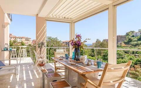 Villa 4 pièces 110 m2 sur 2 niveaux. Clair, aménagement moderne et de bon goût: séjour/salle à manger ouvert avec porte coulissante, baie vitrée avec table pour les repas et TV. Sortie sur la terrasse. 1 chambre avec 1 lit double (160 cm). Sortie sur la terrasse. Cuisine ouverte (four, lave-vaisselle, 4 plaques à induction, bouilloire électrique, micro-ondes, congélateur, cafetière électrique, ilot de cuisine). Sortie sur la terrasse. Douche/bidet/WC. À l'étage supérieur: 3 chambres, chaque chambre avec: 1 lit double (160 cm). Sortie sur la terrasse. Douche/bidet/WC. Air-conditionné, chauffage à air chaud. Grande terrasse partiellement couverte, grande terrasse, jardinet. Meubles de terrasse, barbecue, chaises longues. Très belle vue sur la mer et la ville. A disposition: lave-linge, sèche-cheveux. Internet (Connexion WIFI, gratuit). Place de parking. Borne de recharge électrique. Veuillez noter: logement non-fumeur. Entrée privée, détecteur de fumée, extincteur. IT049021C24KYKM8AD