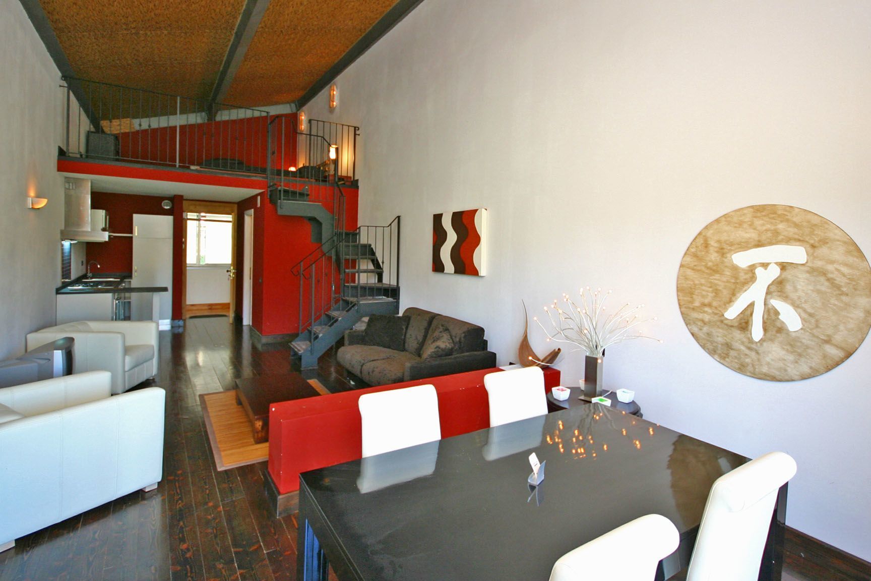 1er étage: coin-cuisson (four, freezer) avec zone repas, séjour (TV) et canapé-lit double, salle de bains avec douche.