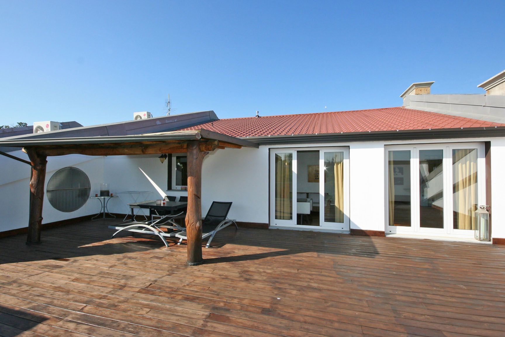 Grande terrasse privée (115 m2) en partie couverte et équipée pour les repas, solarium privé.