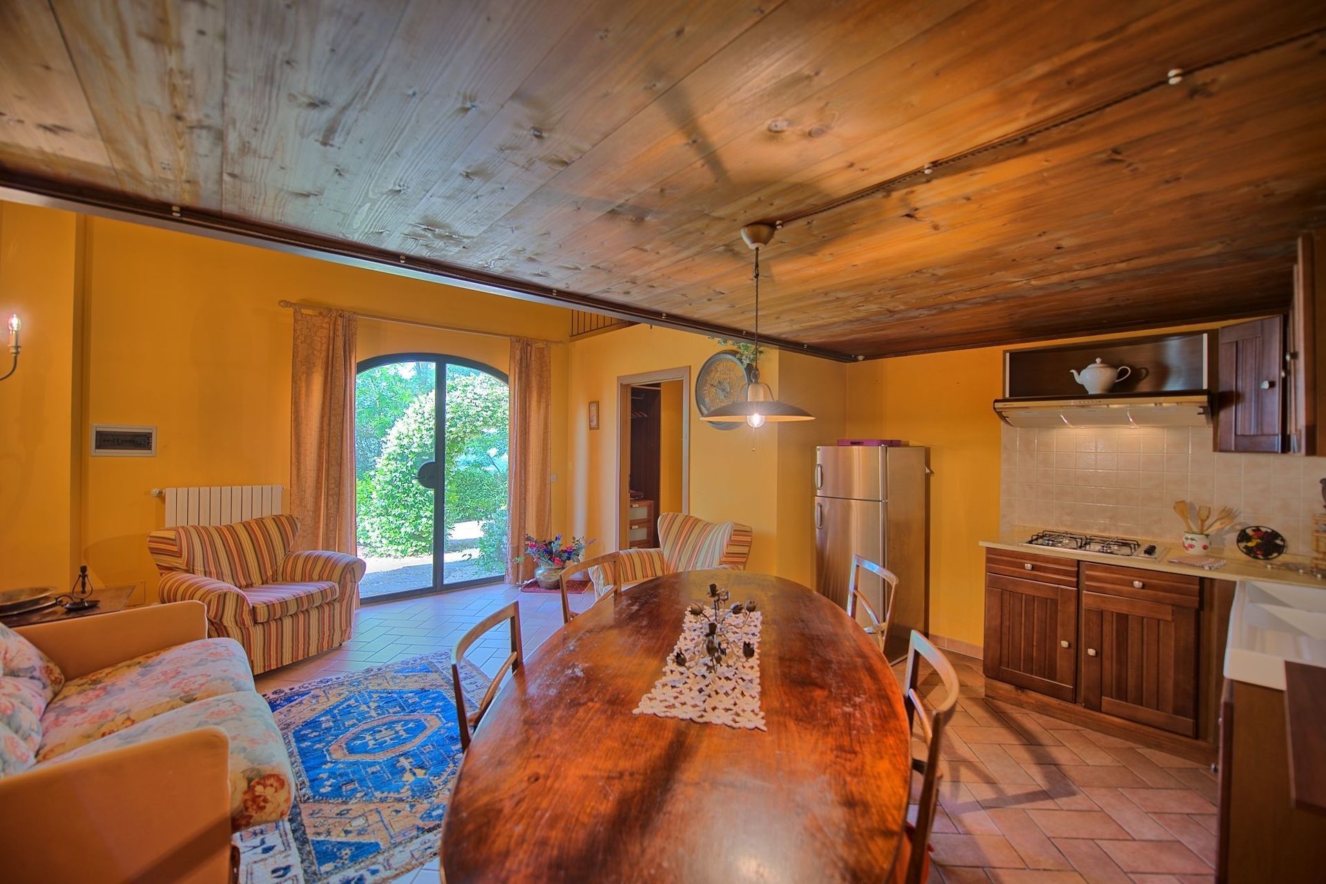 Rez-de-chaussée: grand et lumineux séjour/salle à manger, cuisine (four, freezer, cafetière avec filtre), une chambre double, salle de bains avec douche.