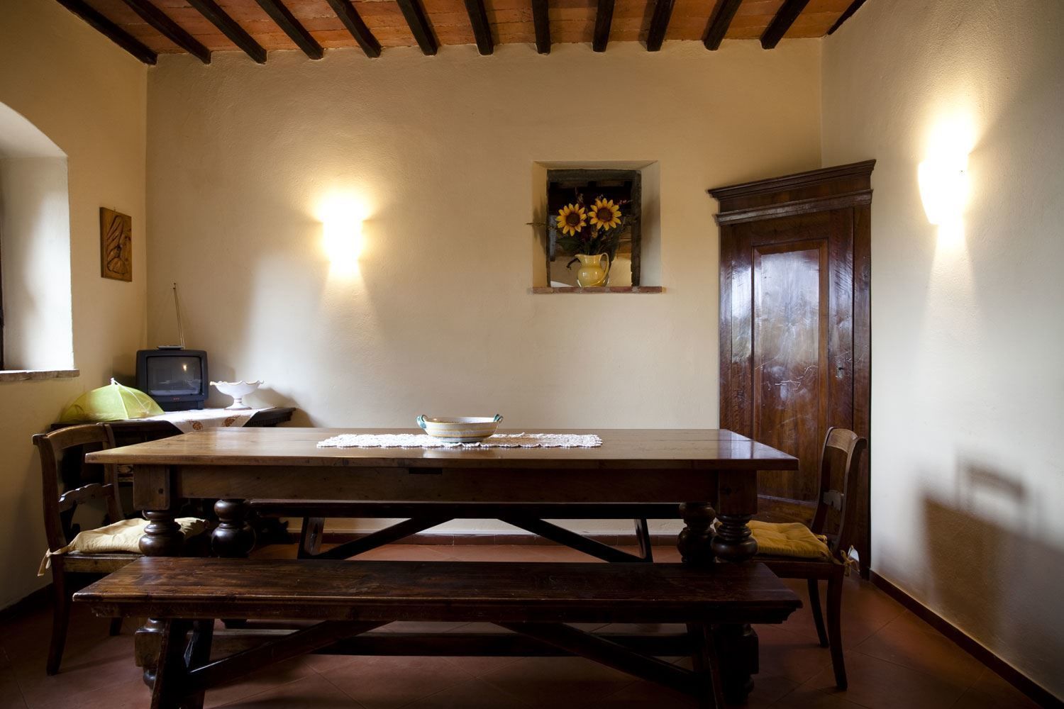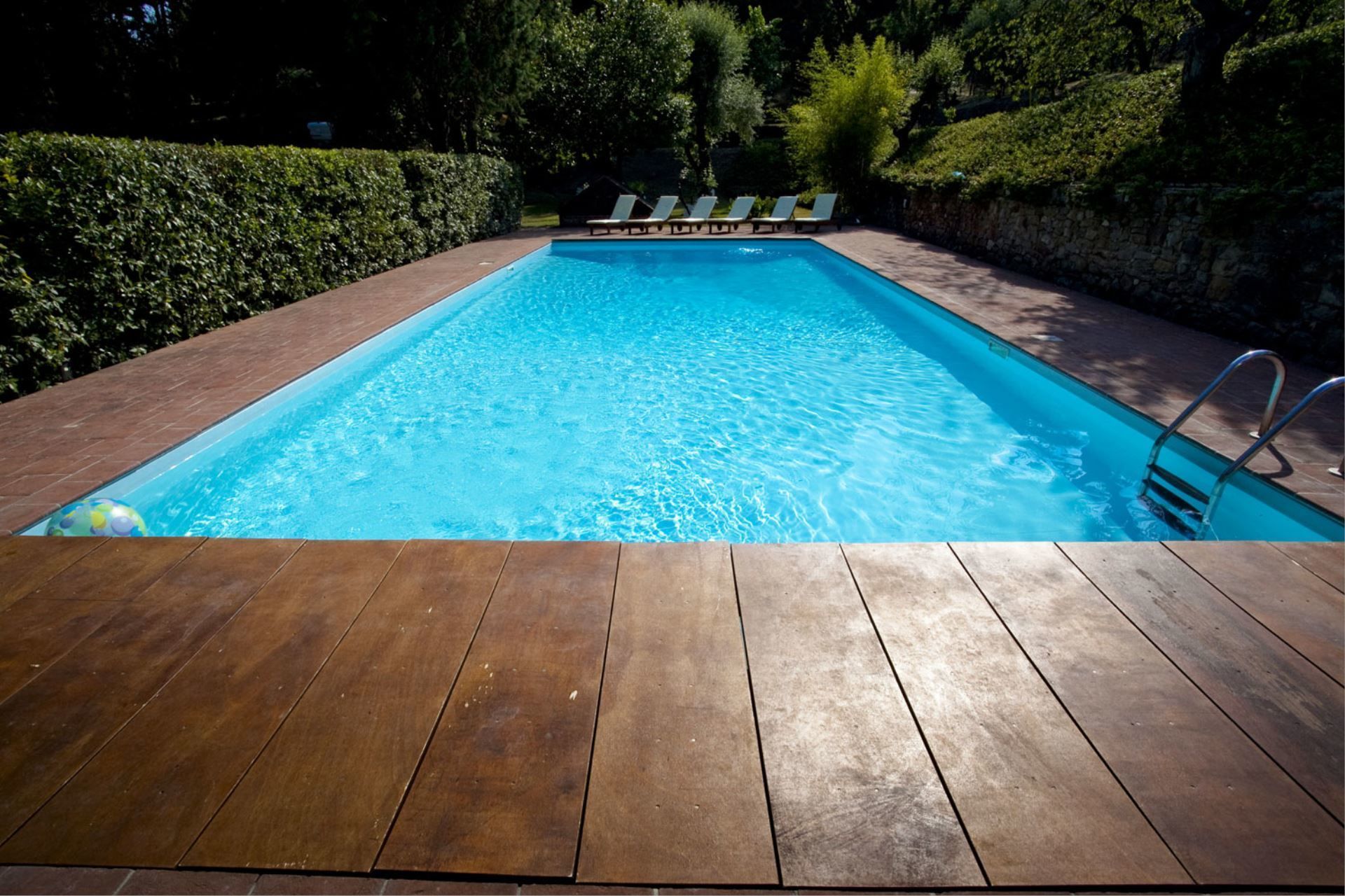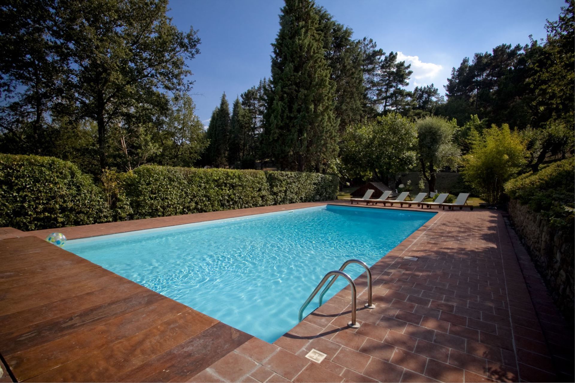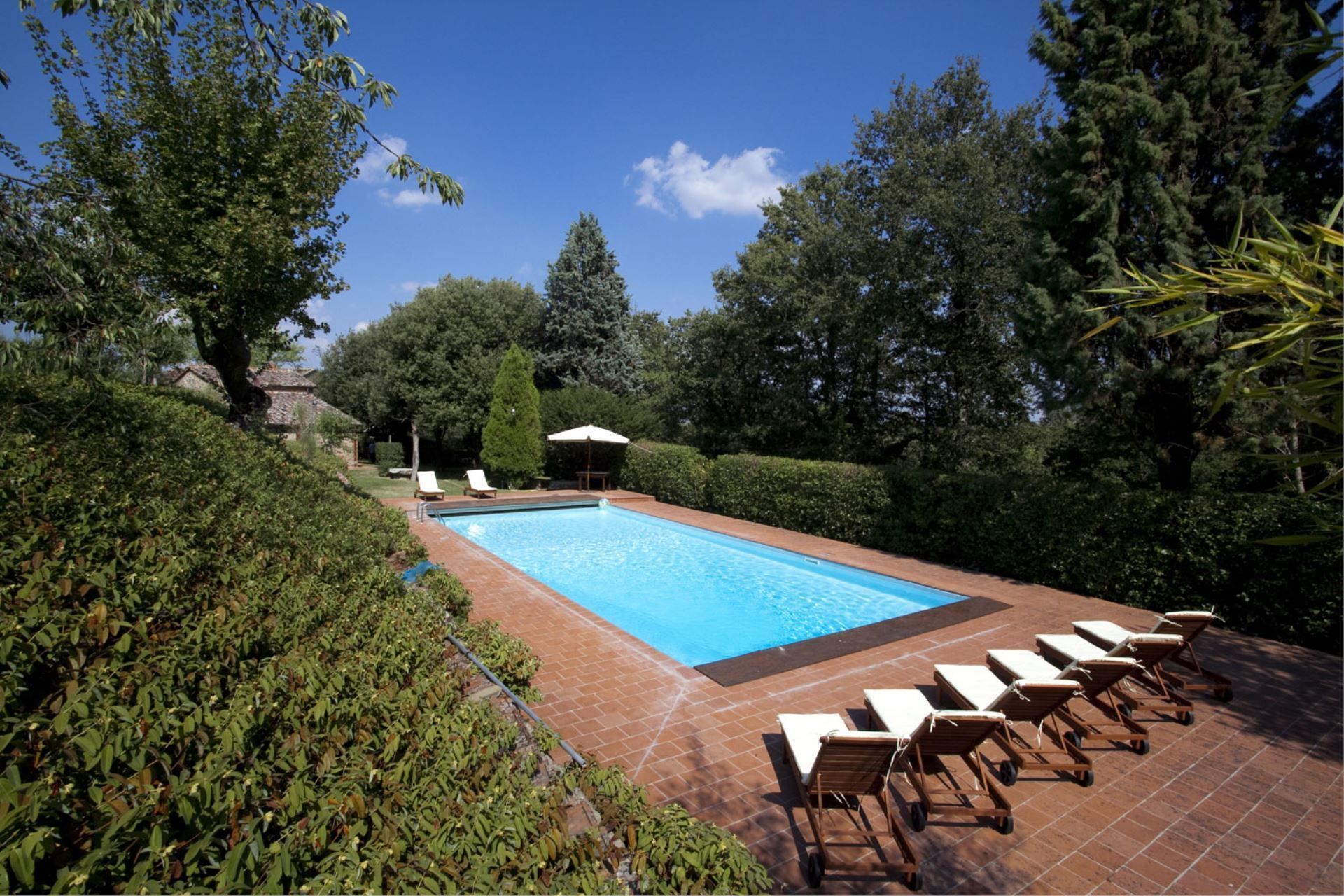 La belle piscine, les intérieurs et les commodités de la villa. A' disposition et par l'utilisation exclusive des hôtes la belle piscine (dim. 7,5 x 16 m, profondeur 1,20 - 2,50 m.) connexion internet, téléphone, four à bois, buanderie avec lave-linge, lavoir et sèche-linge. La villa il Meleto est dotée de ameublement de qualité et confortable avec de mobilier rustique et antiques, qui sont en parfaite harmonie avec le style de la maison avec ses poutres en bois originales et pavements en terre-cuite. A leur arrivé les hôtes recevront un hommage de bienvenue.
