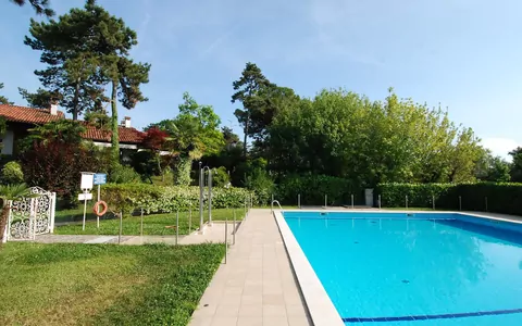 Lignano Pineta: Maison mitoyenne "Villa Quercia", de 3 étages. 15 appartements dans la même entité. Situation tranquille, ensoleillée quartier résidentiel, à 1 km de la mer, à 1 km de la plage. En commun: terrain, jardin, piscine cloturée (12 x 6 m, disponibilité saisonnière: 30.Mai.-31.Aou.). A usage privé: jardin 40 m2 (clôturé), place de parking près de la maison. Magasins 100 m, restaurant, bar, café, arrêt du bus 300 m, plage de sable 1 km.