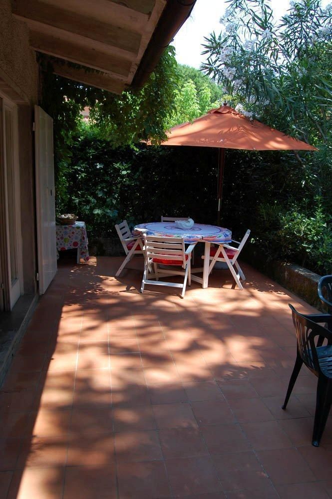 It has a small private garden and a nice outside terracce with umbrella and dining table.