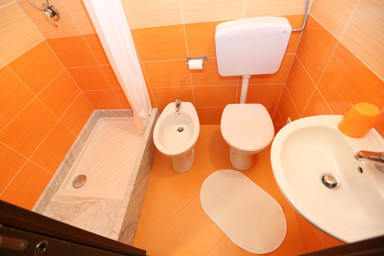 The bathroom has a shower, toilet, bidet and washbasin.