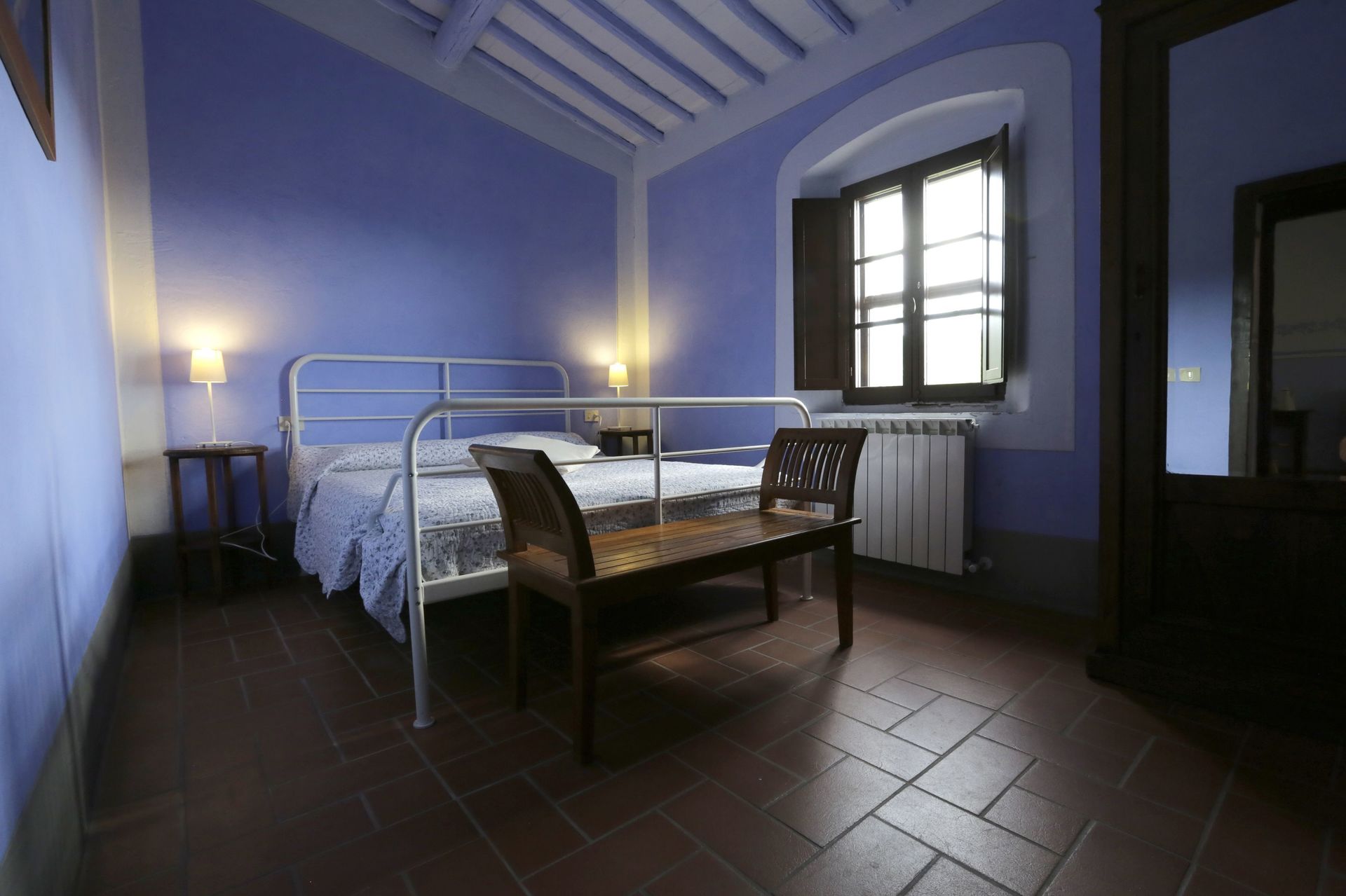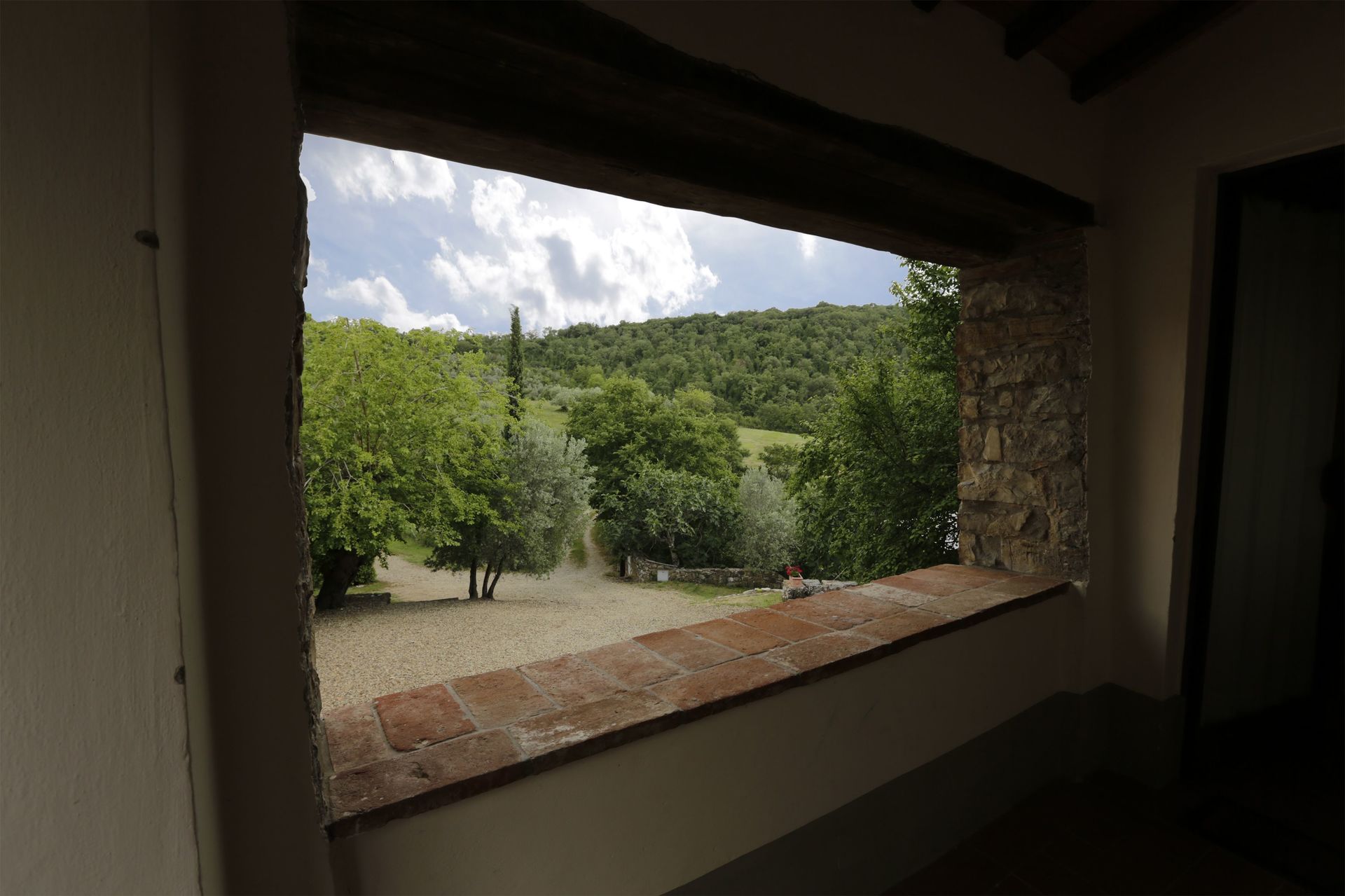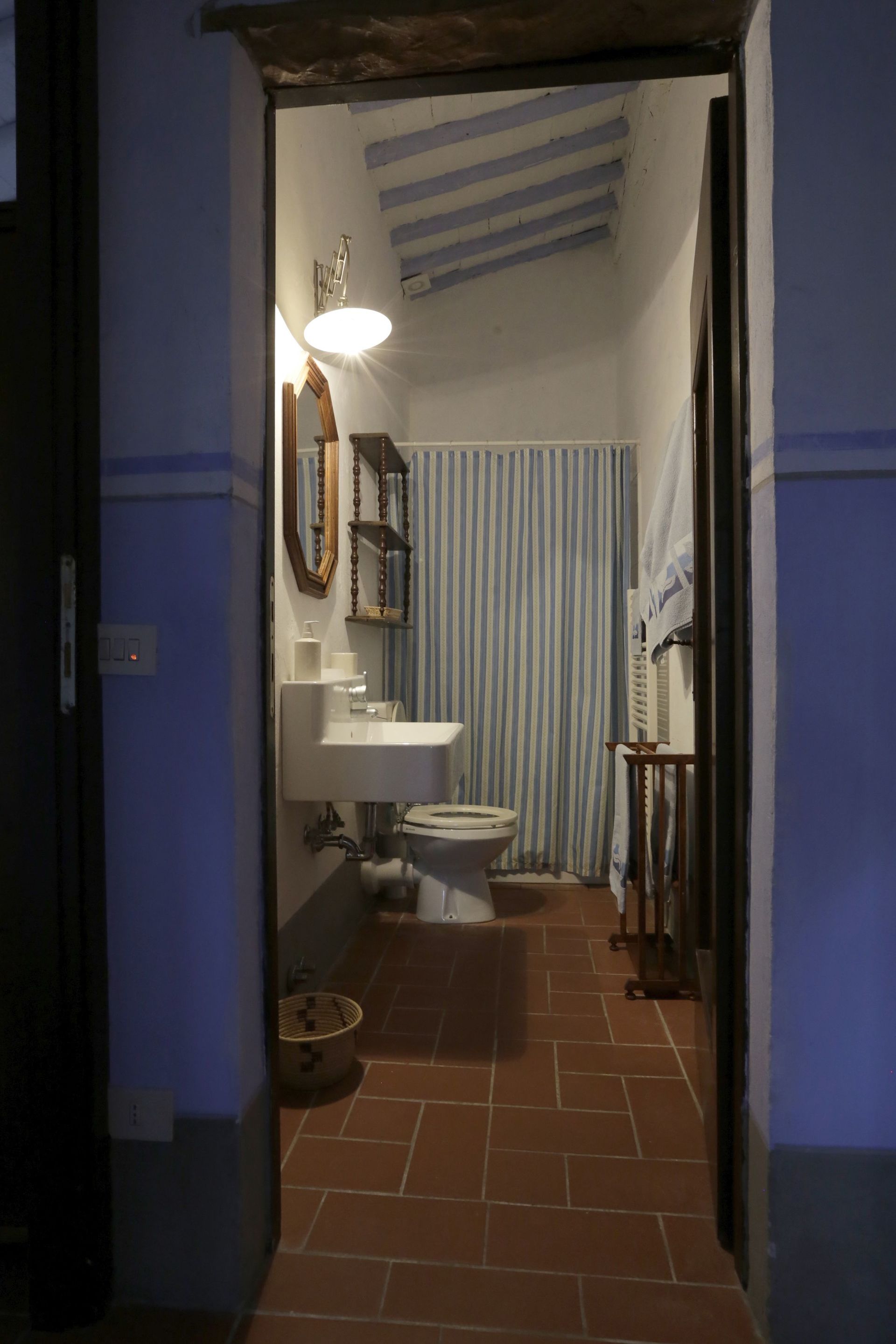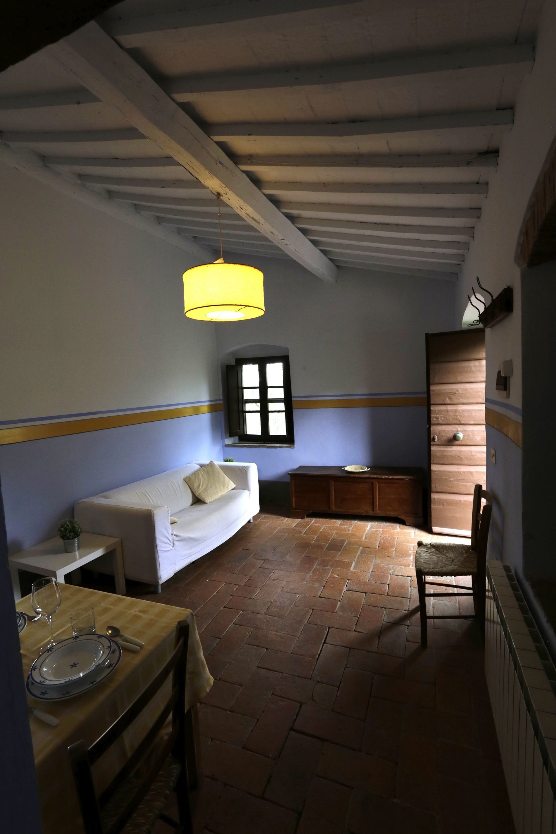 L'entrée principale donne directement dans le séjour. L'appartement est décoré avec des sols en terre cuite toscane selon la tradition et aux plafonds avec les poutres en bois.