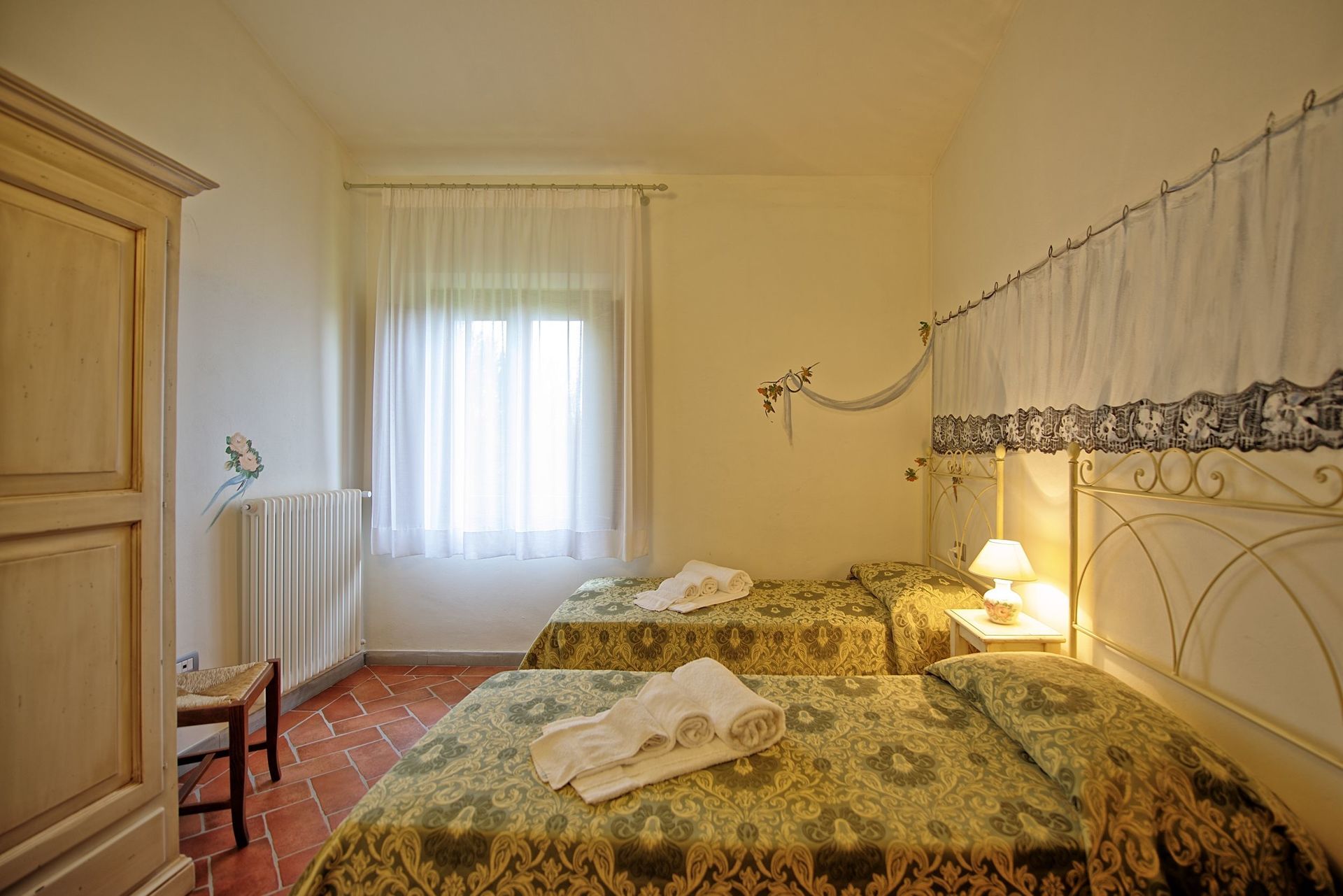 Premier étage: séjour/salle à manger avec coin-cuisson (four, freezer, lave-vaisselle, cafetière avec filtre), salle de bains salle de bains avec douche, une chambre double, une chambre avec 2 lits à une place.